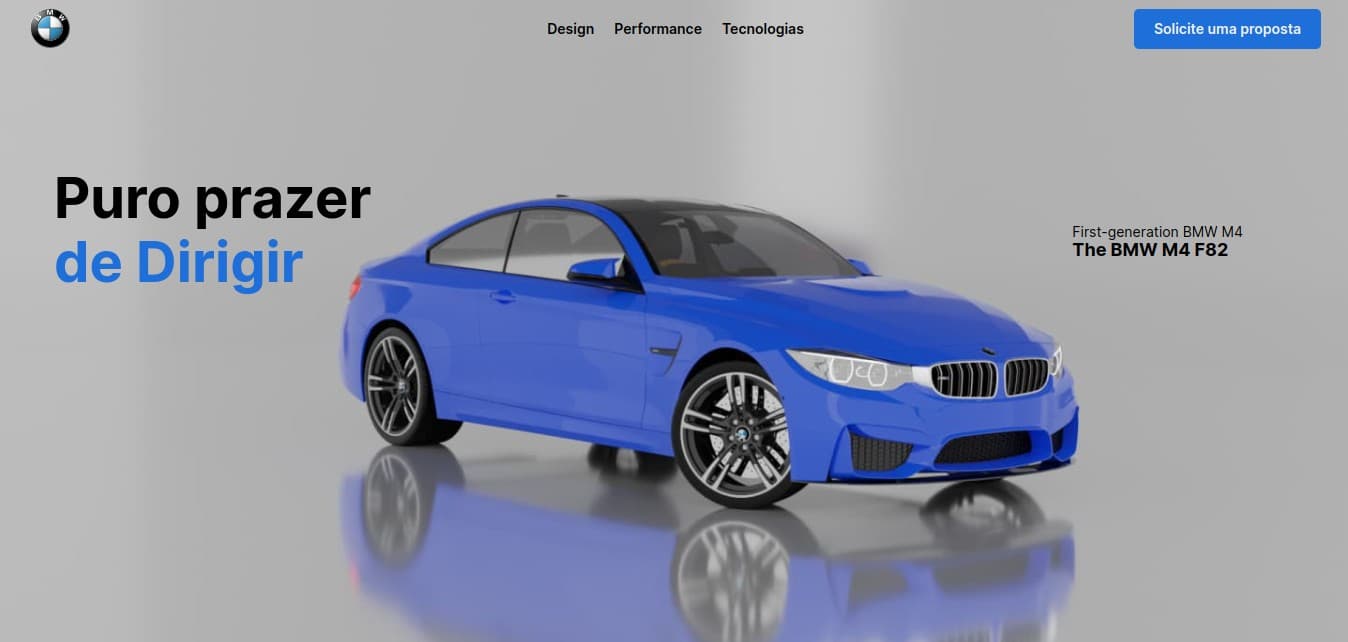 Uma página de apresentação para a BMW M4, design feito por mim, começa com uma imagem de destaque do carro, seguido por uma descrição geral, há seções de especificações técnicas, com informações detalhadas sobre o desempenho, a suspensão, freios, rodas e pneus.